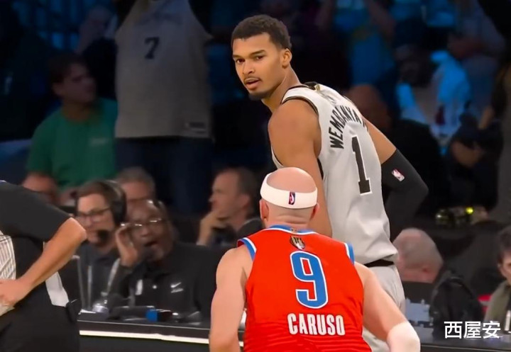 对身高1.96米的卡鲁索来说,这场对决本就充满“尺寸压制”——他拼尽全力起跳,也只能勉强碰到文班的肘部,而文班那记中距离,几乎是在“无干扰”的情况下出手。这种“实力差距+心理挑衅”的双重打击,成了雷霆最终失利的重要伏笔。